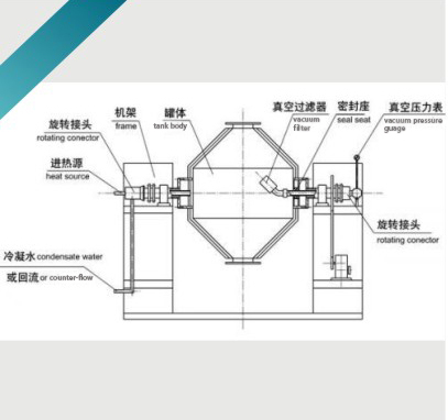 Supply heat energy (such as hot water, steam of low pressure or heat conduction oil) into the closed interlayer. The heat will be transferred to materials to be dried by inner shell. The tank body will be driven to rotate slowly. The materials inside the tank are mixed to strength drying purpose.